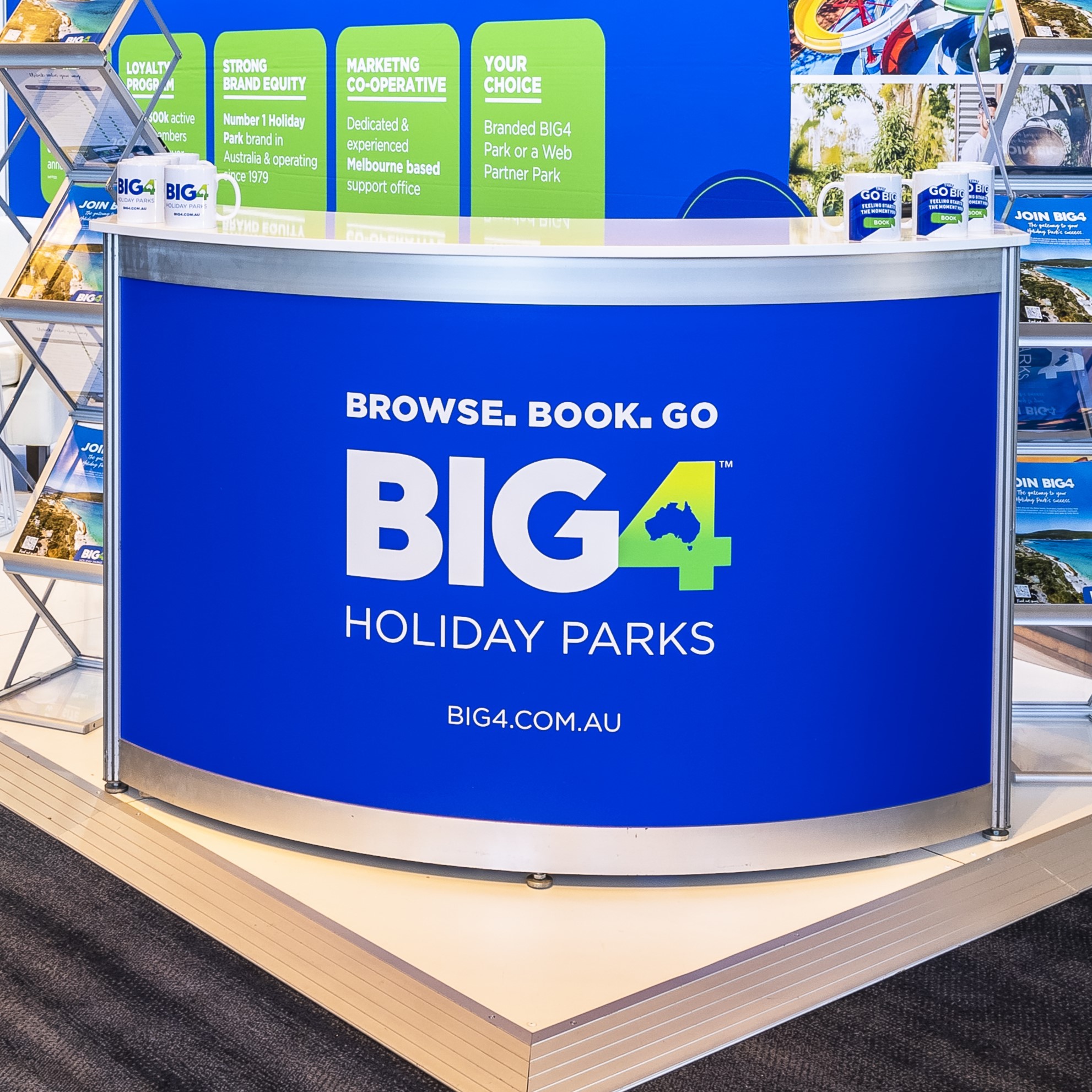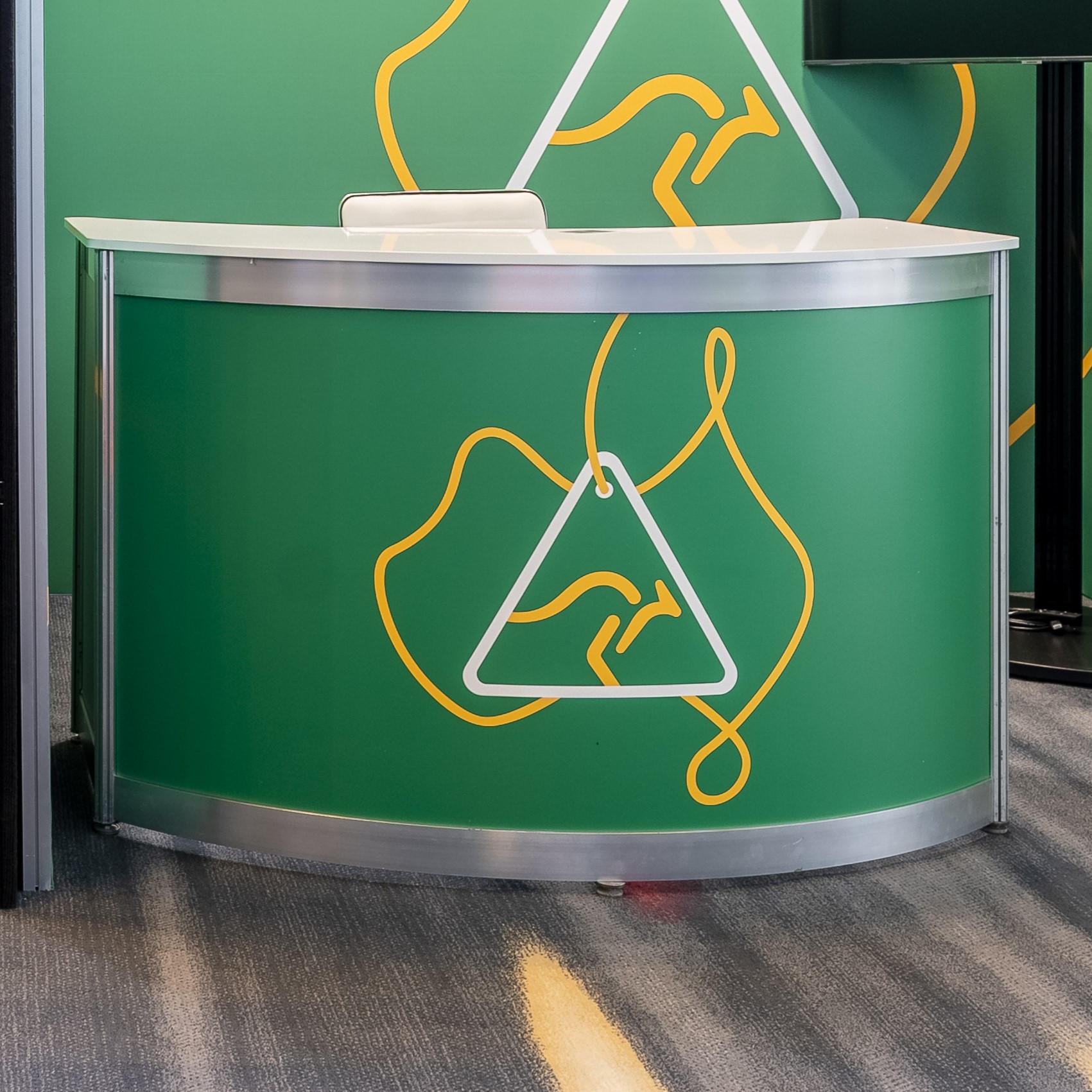 1.5 metre wide curved brochure counter (open back – not lockable), with custom digital print on the front. Add your logo or graphics to a counter to stand out from the rest and represent your branding! Also available in 1.5m rectangle counter.