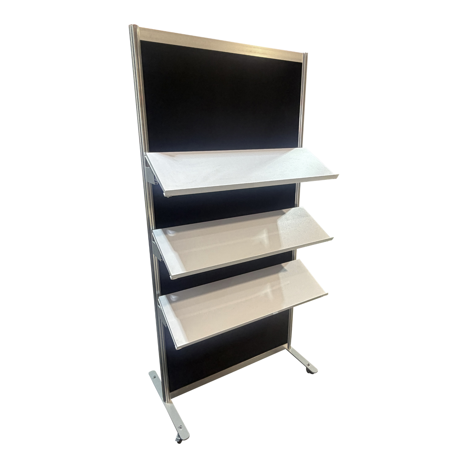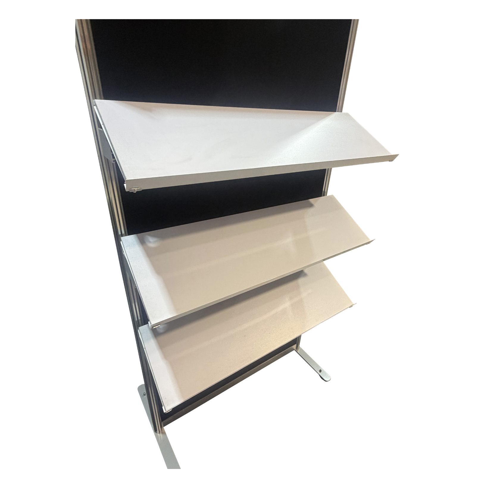 Includes 3x shelves 300mm x 1000mm (height adjustable), on a 2m high x 1m wide black fabric or white octanorm infill board on wheels.